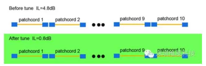 試試時不顛末調芯的10條光纖寬帶線毗連器串連的聯接使用IL=4.8dB,每一項個光纖寬帶線毗連器顛末調芯后再串連的聯接使用IL=0.8dB